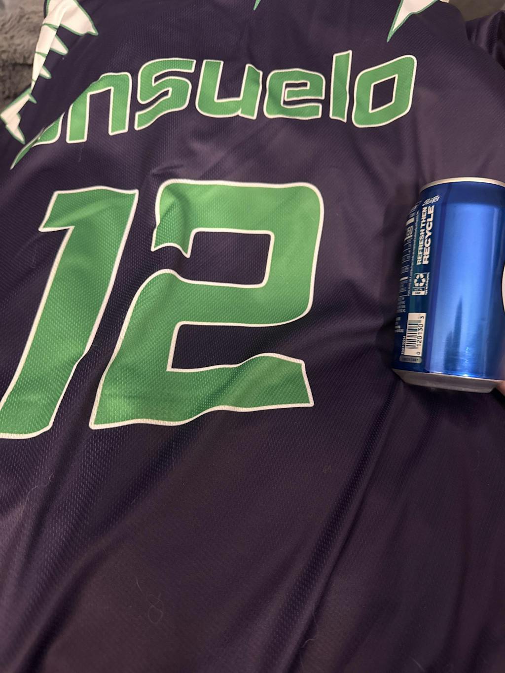 The jersey is well made and high quality, and the printing is clean and looks good. The Dave’s company logo appears to have been moved from the sleeve to the back of the neck, where it is much less conspicuous, which is a good change. My only issue with the jersey is that the pictures are slightly misleading on the color. The jersey is purple, not blue/navy blue as it should be for the “real” design. I still really like the product, but thought anyone considering a purchase should be aware. This is most likely due to the fact that colors appear differently when they are viewed digitally on the site, where they look much bluer than the jersey is in real life. See the attached pictures with a Pepsi can for color reference and a still from AD with the “correct” color.